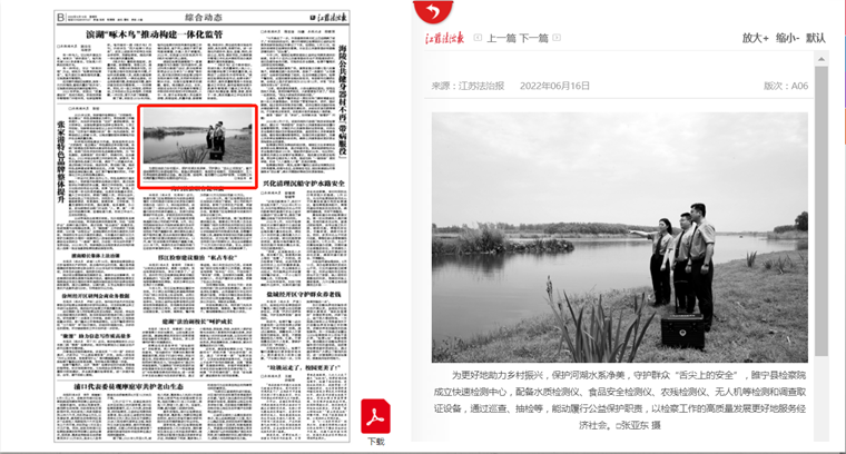为更好地助力乡村振兴,保护河湖水系净美,守护群众“舌尖上的安全”,睢宁县检察院成立快速检测中心,配备水质检测仪、食品安全检测仪、农残检测仪、无人机等检测和调查取证设备,通过巡查、抽检等,能动履行公益保护职责,以检察工作的高质量发展更好地服务经济社会。□张亚东 摄