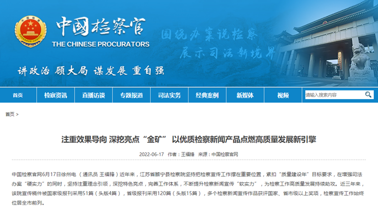 中国检察官网6月17日徐州电 (通讯员 王福锋)近年来,江苏省睢宁县检察院坚持把检察宣传工作摆在重要位置,紧扣“质量建设年”目标要求,在增强司法办案“硬实力”的同时,坚持注重理念引领,深挖特色亮点,完善工作体系,不断提升检察新闻宣传“软实力”,为检察工作高质量发展持续助攻。近三年来,该院宣传稿件被国家级报刊采用51篇(头版4篇),省级报刊采用120篇(头版15篇),多个检察新闻宣传作品获评国家、省市级以上奖项,检察宣传工作始终位居全市前列。