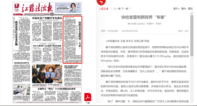 快检室投入使用不但为开展公益诉讼工作提供了规范专业的技术参考,睢宁县检察院还以此为平台,加强与行政机关在保护食品安全、维护生态环境方面的协作配合,聘请行政机关专业人员兼任快检室检察官助理,提升检测能力和检测效率,从而形成了守护公益的合力,保证了公益诉讼办案质效。